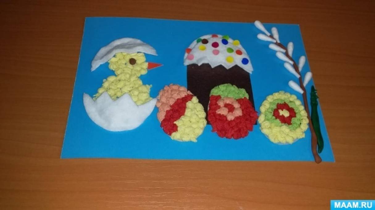 Вот поделка «Цыплёнок из ниток» – тоже вполне посильная задача для малышей младшей группы. Выполняется на тарелке, которую родители потом смогут повесить над столом, как панно. Пусть украшение радует глаз всю пасхальную неделю – ведь, к слову сказать, праздник действительно длится долго (40 дней по православной традиции).